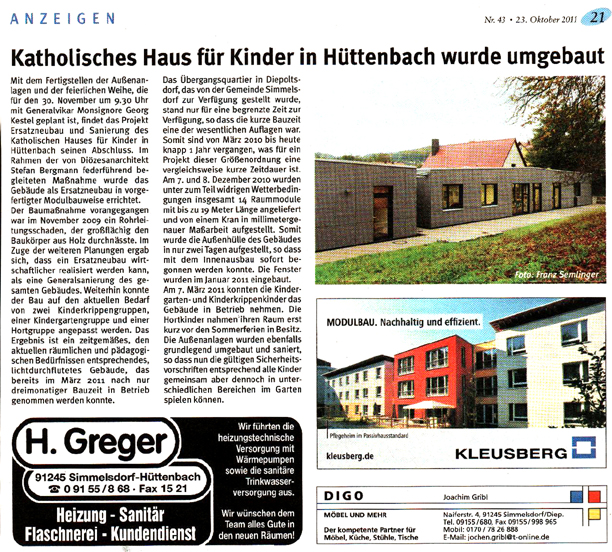 Heizungs- und Sanitärarbeiten: Katholischer Kindergartenneubau in Hüttenbach.